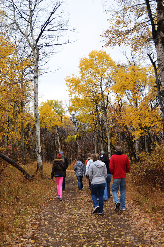 In the morning we had an awesome breakfast and then watched a video about temples before heading out on a hike. I was so nervous about the hike being a total disaster as it had been pouring rain the whole night, was definitely still very cold and wet when we woke up, and we were basically surrounded by a thick cloud. It was so gorgeous up at the cabin with all the fall foliage and I wanted our youth to be immersed in it and enjoy the natural beauty as we hiked. I thought about canceling it or changing it off and on in my head all night, but instead just hyped it up and made like we were planning on it all along, rain or shine or fog or whatever.